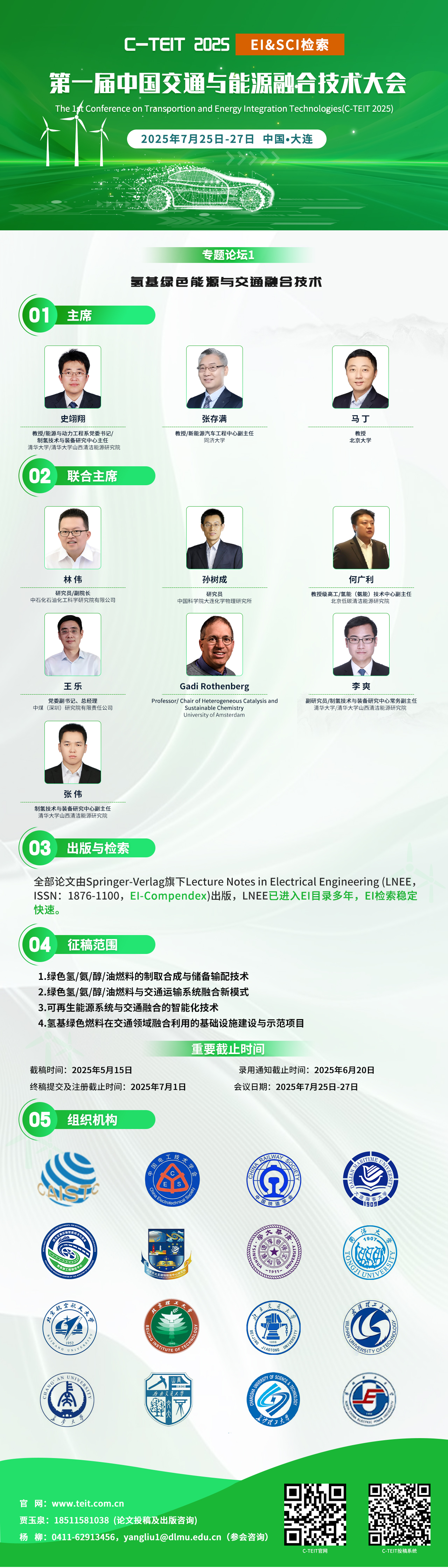 由全国能源与交通融合创新发展联合体成员单位、中国国际科学技术合作协会、中国中车集团有限公司等单位共同主办的第一届中国交通与能源融合技术大会(C-TEIT2025)将于7月25日至27日在美丽的滨海城市大连盛大召开。本次盛会由中国电工技术学会、中国造船工程学会、中国铁道学会联合主办。大连海事大学、综合交通运输智能技术与装备教育部工程研究中心、中国国际科学技术合作协会能源与交通融合专业委员会、国家能源交通融合发展研究院、大连东北亚国际航运中心研究院联合承办。