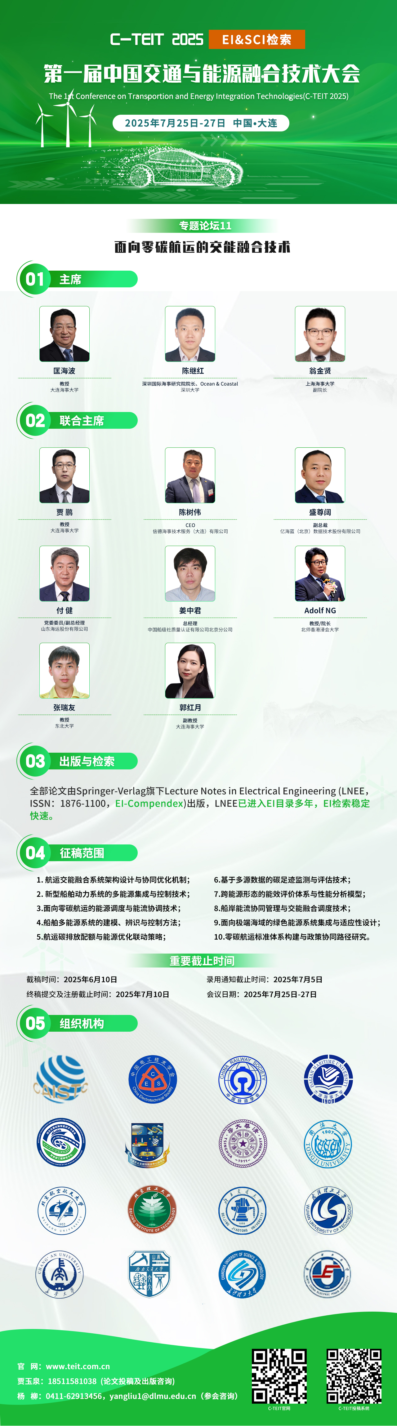 由全国能源与交通融合创新发展联合体成员单位、中国国际科学技术合作协会、中国中车集团有限公司等单位共同主办的第一届中国交通与能源融合技术大会(C-TEIT2025)将于7月25日至27日在美丽的滨海城市大连盛大召开。本次盛会由中国电工技术学会、中国造船工程学会、中国铁道学会联合主办。大连海事大学、综合交通运输智能技术与装备教育部工程研究中心、中国国际科学技术合作协会能源与交通融合专业委员会、国家能源交通融合发展研究院、大连东北亚国际航运中心研究院联合承办。